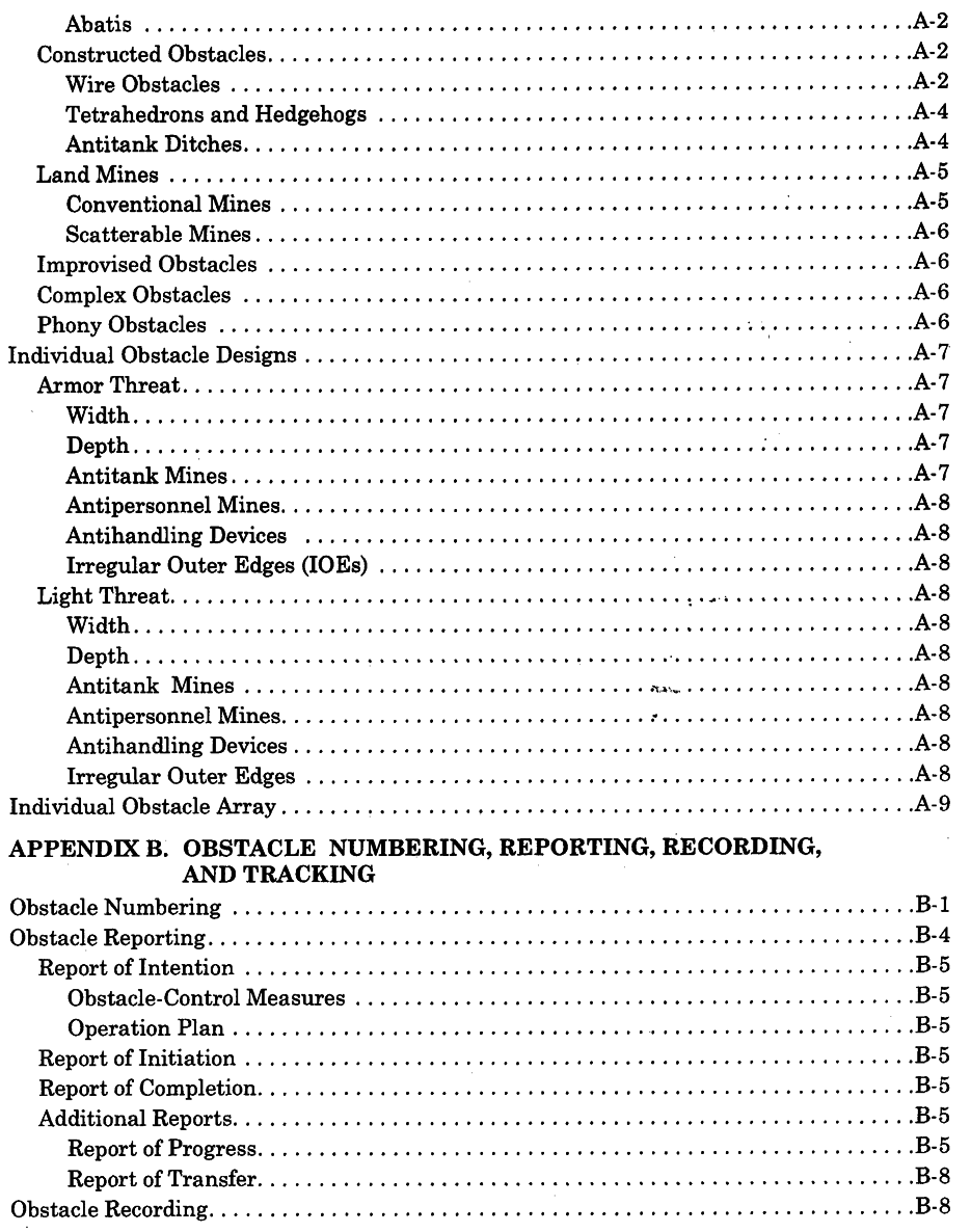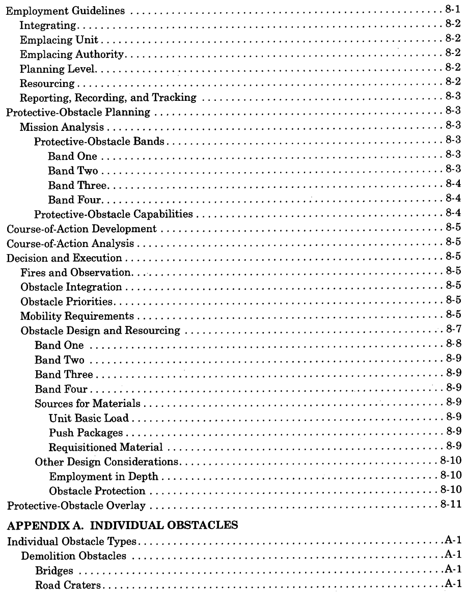 Three appendixes provide the additional tools that facilitate successful planning and execution. Appendix A provides information on individual obstacles. Appendix B addresses the critical activities in reporting, recording, and tracking. Finally, Appendix C describes obstacle resourcing and supply.