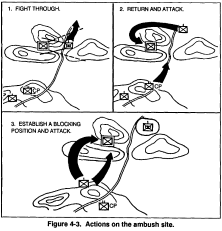 b. Ambushes are fought through without delay. If the battalion is ambushed, the march unit in the kill zone increases speed, fights through, and reports the ambush. The battalion commander may order a march unit already beyond the kill zone to return to the ambush site (Figure 4-3). The march unit conducts a hasty attack to clear it of enemy or establishes a blocking position on the far side of the kill zone while a following march unit conducts the hasty attack. Follow-on march units may also be ordered to aid in extracting the ambushed march unit from the kill zone either through assault by fire or by direct assault on the ambush position.