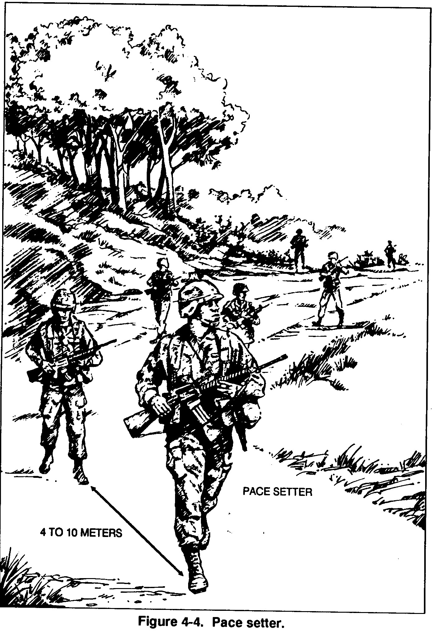 The pace setter is an experienced soldier, carrying the same load as the majority of the soldiers, and marching from 4 to 10 meters at the head of the column (Figure 4-4).