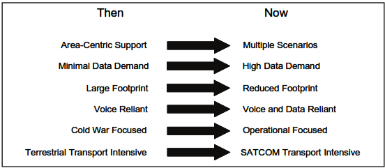 1-41. Increased Reliance on SATCOM. To support modularity designs and capabilities, mobility and battle command systems, tactical elements need to untether from terrestrial transport systems. The capability to fight in a non-contiguos, asymmetrical battlefield within an enclave operational environment will become more the norm than the contiguous battlefield of the Cold War era. These enclaves are, more often than not, beyond li