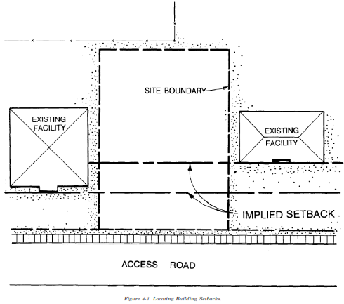 (3) Setbacks. Setbacks are the distances between buildings and property frontages, roadways, parking areas and other buildings. Building setbacks may be established by the installation design guide or by historic usage. If building setbacks have been established in an area, these setbacks should be observed. Where setbacks are not established, new buildings should be located in relationship to the surrounding structures. Figure 4-1 illustrates an implied setback area between two existing structures. A new building should normally conform and align with the front of one or other other building. It should not be placed in front of the foremost structure, behind the rear structure, or in the middle space between the two structures.