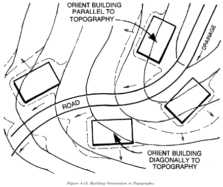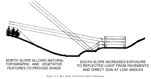 (2) Other. Other site-specific conditions can influence building alignment. Figure 4-4 shows how slope orientation may impact the sunlight and subsequent heat a building receives. Slope orientation may increase exposure to the sun or may, in combination with structures or vegetation, create pockets of shade. Figure 4-5 illustrates how building orientation may be modified to take advantage of or reduce the impact of prevailing winds. Existing topography and vegetation can also create microclimatic pockets. These pockets alter normal weather conditions by reducing available sunlight, creating shade and reducing prevailing winds.