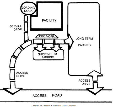 (2) Access Drives. Normally, traffic enters and exits the site at the same access point or points, but not all vehicles have the same purpose or destination. Figure 4-6 illustrates a typical circulation flow diagram. Understanding traffic flow and patterns on site helps determine the location of turn-around areas, appropriate turning radii at intersections and appropriate drive widths. Different drive widths can be used for different types of