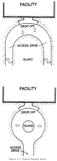 (3) Dropoff Areas. Drop-off areas should be provided for office, commercial, educational and community facilities with high use. This promotes both vehicular and pedestrian traffic flow. Figure 4-7 illustrates typical drop-off areas. Drop-off areas should be: