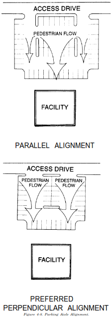 (d) Parking aisles should be aligned towards the building entrance to encourage more organized pedestrian flow. This alignment limits the number of places where pedestrian traffic must cross vehicular traffic. Barrier-free parking should not require movement across vehicular circulation paths. Figure 4-8 illustrates appropriate alignment.