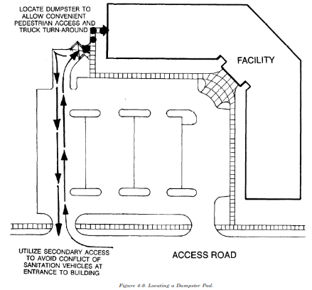 (a) Sanitation Vehicles. The circulation of sanitation vehicles is dictated by the locations of the dumpster pads. Pad locations should: provide convenient access for pedestrians taking garbage to the dumpster, provide convenient and easy access to vehicles emptying the dumpster, be in less visible areas of the site (e.g., the rear of buildings), and have sufficient room for screening with plant material, fences and/or walls. Sanitation vehicles should not have to turn around to exit the facility. When more than one dumpster location is required, it is desirable for sanitation vehicles to access each pad as part of a continuous loop. When the dumpster for a facility is located in the principal parking lot, the pad should be removed physically and visually from the building entrance and major pedestrian and vehicular circulation routes. Figure 4-9 illustrates how to locate a dumpster pad.