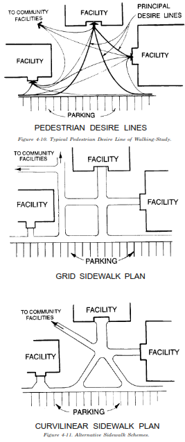 (1) Pedestrian Desire Lines. Pedestrian circulation should be based on pedestrians’ desired lines of walking between facilities. It is fairly simple to anticipate desire lines. People tend to follow the
