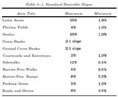 b. Standard Desirable Slopes. Grading should maintain existing topography while recognizing standard gradients for various functions and activities. Table 4-1 provides standard desirable slopes for various land uses.