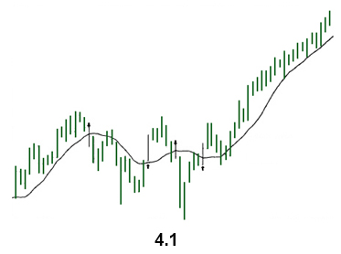 Moving Average: MA is one of the widely used of all technical indicators. As its name implies, it indicates the average price of a security over a defined time period. Its purpose is to signal that a new trend has begun, or the old trend has been reversed. It is used to track the trend, therefore it is a lagging indicator. Moving averages can be used to determine whether the security moves in a downtrend or in an uptrend based on the direction of the moving average. If a moving average is heading upward, the security is in an uptrend. If a moving average is moving downward, the security is in a downtrend (see figure 4.1 ).
