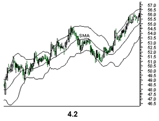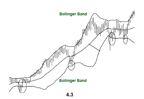 Bollinger Bands: This technique was developed by John Bollinger. The two trading bands are plotted around the moving average; the closer the prices to the lower band, the more oversold is the market, and the closer the price moves to the upper band, the more overbought is the market. When the market becomes more volatile, the bands move further away from the moving average, becoming wider. During less volatile periods the bands move closer to the average becoming narrower. The narrowing of bands is often used by chartists as a signal that the volatility is going to increase.