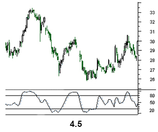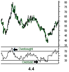 A reading below 30 indicates that the security is oversold, and a reading above 70 suggests that the security is oversold. Because of the changes that take place in bull and bear markets, the 80 level is usually considered overbought in bul markets, and the 20 level is referred to as an oversold level in bear markets.