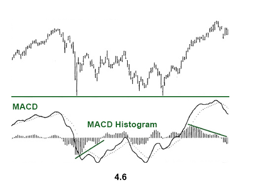 A very important aspect of the MACD indicator is the MACD histogram which is plotted on the centerline and is shown by vertical bars. It indicates the difference between two MACD lines. When the MACD lines are positive, the histogram is above the zero line. When the histogram is over the zero line, but starts to fall , the uptrend is weakening. When the histogram is below the zero line and starts to move upward, the downtrend is weakening.
