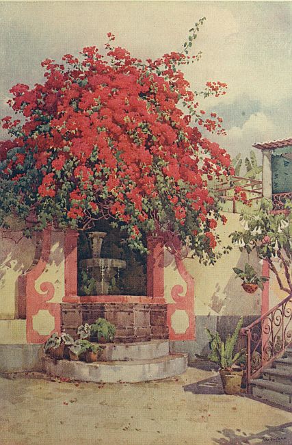 ON the east side of the town lie many quintas with good gardens, especially up the very steep Caminho do Monte, or Mount Road, as it is commonly called by the English. The road itself at some seasons of the year is converted into a veritable garden, as its high wall is so clothed with overhanging creepers which have strayed from the gardens behind, that it presents more the aspect of the terrace wall of a flower garden than that of one of the most frequented highroads of a town. At a height of between 500 and 600 feet, just below the level road which crosses it, which is known as the Levada da Santa Luzia, several villas seem to vie with each other as to which can contribute the greatest wealth of plants to decorate the walls. Possibly the best moment to see the road is in December, when the gorgeous mass of colour provided by the great shrubs of poinsettias hanging over the walls of the Quinta Santa Luzia is in all its splendour. Side by side with the scarlet blossoms come the great white trumpets of the daturas, hanging in horizontal rows. Below, the deep rose-coloured buds of the bougainvillea have not yet unfurled, so there is no jarring note in the scheme of colour, as the immense bank of plumbago, with its soft blue blossoms, harmonizes admirably. On the other side of the road, as if determined to continue the effect of the flaming red, is a great cluster of Aloe arborescens, with their spikes of red flowers—not, it is true, as brilliant in colouring as their opposite neighbours, the poinsettias, but very beautiful in themselves. These, with clumps of sweet-scented geraniums, echiums, and many other plants, clothe the walls of the garden of the Quinta da Levada. But the stream of gorgeous colour is not yet complete, as the Bougainvillea spectabile, with its brick-red blossoms, is already giving promise of glories to come in a very short time. This plant, which covers the corridor and hangs over an old garden well at Quinta Sant Andrea, is the finest specimen of its kind in the island. From the immense size of its stem, it is easily seen that the plant must be a great age, and for many years has borne its burden of blossoms and called forth the admiration of untold numbers of tourists through successive winters, as they make their noisy descent in the basket sledges or running cars from the mount.