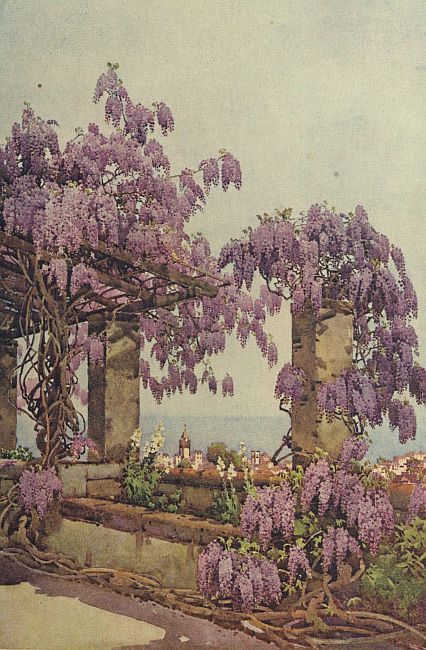 The entrance to the garden leads one to expect a wealth of flowers in the garden below, as a vision of pink begonias with a profusion of blossom, tall feathery bamboos, and long hanging ferns, greets the eye at the very door. On the terrace in front of the house stands one of the finest wistarias. It clothes the whole wall, makes a purple canopy to the corridor, climbs up the square pillars, and has even taken possession of the flagstaff, so in the early days of April the whole air is filled with its delicate bean-like scent. The beauty of its blossoms is short-lived, and possibly for this reason is all the more appreciated. A few short days and the heat of the sun will have taken all the colour out of its purple tassels, the leaves will begin to appear, and all its glory is departed. Some of the winter-flowering creepers last in beauty so long—for weeks or almost months—such as the bougainvilleas and Bignonia venustus, that if such a thing were possible, one becomes almost wearied of their beauty, and passes them by almost unnoticed. But with wistaria it is different: it must be noticed and appreciated at once or not at all, as the colour changes and fades with every passing hour.