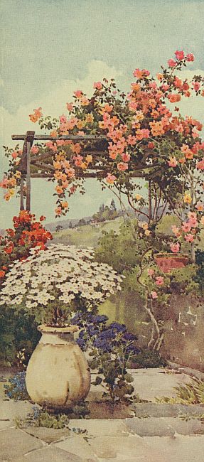 At again a lower level on yet another terrace is a little sunk garden, which seems to provide a never-ending wealth of colour and blossom. Between its box-edged beds run narrow walks, paved with flag-stones, a welcome relief to the usual paving with little round cobble-stones, and certainly pleasanter to walk upon, and in spring, when flowers spring up in every direction, many a little treasure appears between the stones. One I remember I could never regard as a weed, though many people seemed merely to look upon it as such, was Anamotheca cruenta, a tiny little bulb which bears very brilliant salmon-pink blossoms in clusters of five or six, each with a deep crimson mark in it. It is a native of the Cape, from where it was no doubt originally imported, and seems to sow itself freely. The borders are devoted to large clumps of such plants as eupatoriums, salvias, euphorbias, pelargoniums, albizzias, justicias, begonias, crinums, and imantophyllums, while in the centre of the garden rose-beds carpeted with freesias, and beds of the dark purple heliotrope, pink begonias, and lilac stocks, provide good masses of colour. Over the wall at one end of the garden, which is the boundary wall of the garden proper, hang great bushes of poinsettias, daturas, and large clumps of echiums, and on the top of the low wall on the other side, large pots of azaleas, diosmas, begonias, and ivy-leaf geraniums stand with very good effect.