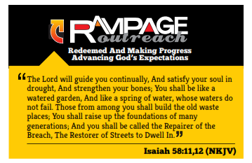 R.A.M.P.A.G.E. Outreach ’s mandate, based on Isaiah 58:11, 12, is to engage culture and bring a restoration of the values of God’s kingdom into our society. Our threefold mission is to: