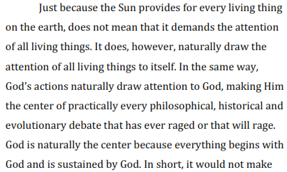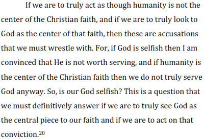 In the same way, God draws attention to Himself through His interactions with mankind and with all creation. We as human beings are not the only ones who receive a portion of God’s grace, therefore we are not the center of all that God does. This thought seems to devalue the idea that we are God’s prized creation, and, to a degree, seems to portray God as a selfish individual. Naturally, these are problems that must be overcome.