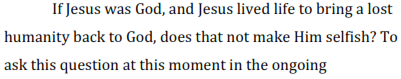 “Now hat I’ve had time to think about it. I would tell that student that if God is truly the greatest good on this earth, would He be loving us if He didn’t draw us toward what is best for us (even if that happens to be Himself)? Doesn’t His courting, luring, pushing, calling, and even “threatening” demonstrate His love? If He didn’t do all of that, wouldn’t we accuse Him of being unloving in the end, when all things are revealed?”24