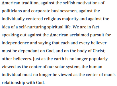 We must deny our individualism within the body of Christ. All believers are to work as one body under the Kingship of Jesus Christ. We must disciple one another, both giving and receiving knowledge. We must be willing to invest our time. We have heard that discipleship is life-on-life. It takes more than a Sunday morning and a Wednesday afternoon to produce adequate members of the Church body and to become capable members of the Church body. It is an every day thing. We live and breathe as a community. I think, possibly, that one of the greatest things we could do for the Kingdom of God is to eliminate our discipleship programs and return to a complete lifestyle of one-on-one discipleship. In order for discipleship to work within our churches, we must forsake the hit it and quit it mentality of discipleship.
