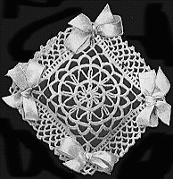 Trim with ribbon as follows: starting at top, place ribbon under the ch 8 loops around entire cushion having the wrong side of ribbon toward you, pull up a 2 inch loop between each ch, then holding cushion with 13