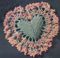 FINISHING: Fill heart with cotton batting and sachet powder, sew opening closed. If desired, another bag may be made reversing the colors. If desired, lace ribbon through loops and tie in bow.