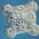 Attach thread to any free loop at center, ch 5, holding back on hook the last loop of each d tr (make d tr in free loop of next motif) 3 times; thread over and draw through all loops on hook. Break off. Make satin pillow the same shape as motifs. Sew motifs to pillow.
