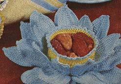 MATERIALS--Lily Soft Spun Yarn:--1 ball each Pink, Blue, Green and Yellow (sufficient for 12 Cups), with crochet hook size 3; Lily Sil-Tone Mercerized Crochet Cotton:--1 ball each Med. Green, Beauty Rose, Blue, Orange and Lavender, with crochet hook size 10.
