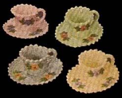 FLOWER In Beauty Rose Sil-Tone, (ch 4, dc in 4th ch from hook, ch 3, sl st in same st) 5 times, sl st at base of 1st petal. Fasten off. Make 5. Sew a flower on center of stem between leaves. Tack one on each side of Cup and 3 on Saucer.