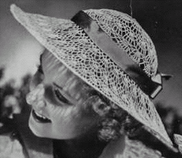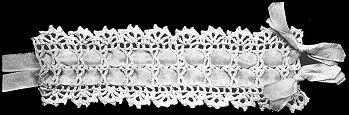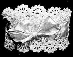 Materials: Clark's O.N.T. (5 balls) or J. & P. Coats (3 balls) Mercerized Crochet, size 30, color 9 Yellow. Milward's steel crochet hook No. 7. 2 yds. millinery wire and 2 yds. of ribbon.