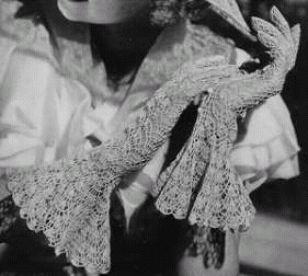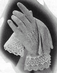 Gauntlet. 1st rnd: Attach thread at opening point on foundation ch at wrist. Ch 3, skip 1 sp and d c, * 5 d c in next ch st, ch 3, skip next 5-d c shell, s c in next loop. Ch 5, skip s c, s c in next loop. Ch 3, skip next s c, repeat from * spacing work so that 11 5-d c groups are made, then ch 3, s c in 1st st of ch-3 first made.