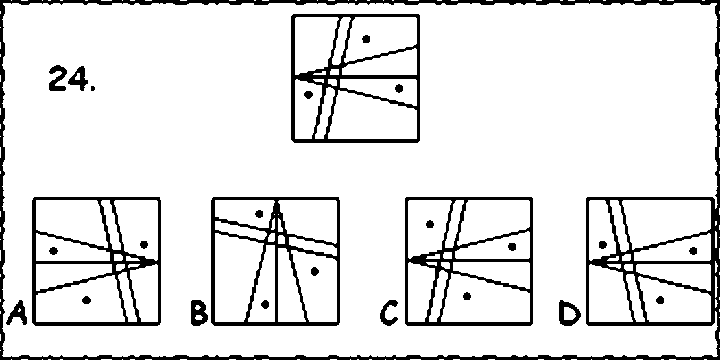 Each spatial-relationship question requires different thinking skills. Rotation (23) is fairly easy for most people, but finding a correct mirror image (24) is difficult even for people who own several mirrors (which the slaves did not).