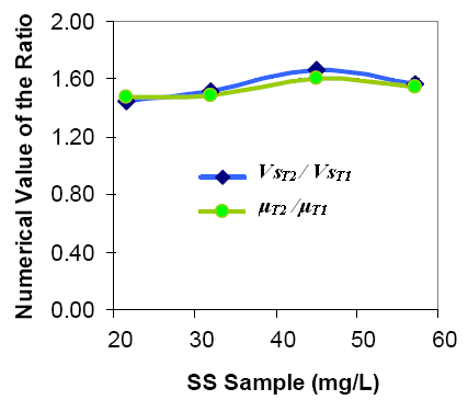 Fig. 11. Ratios of VsT2 / VsT1 and μT2 /μT1 for Different suspended solid (SS) concentrations.