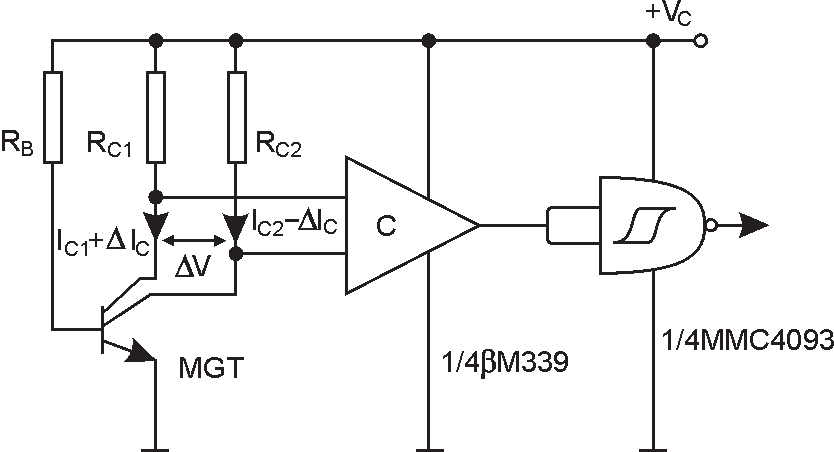principle diagram of the transducer is shown vertical bipolar magnetotransistor with double