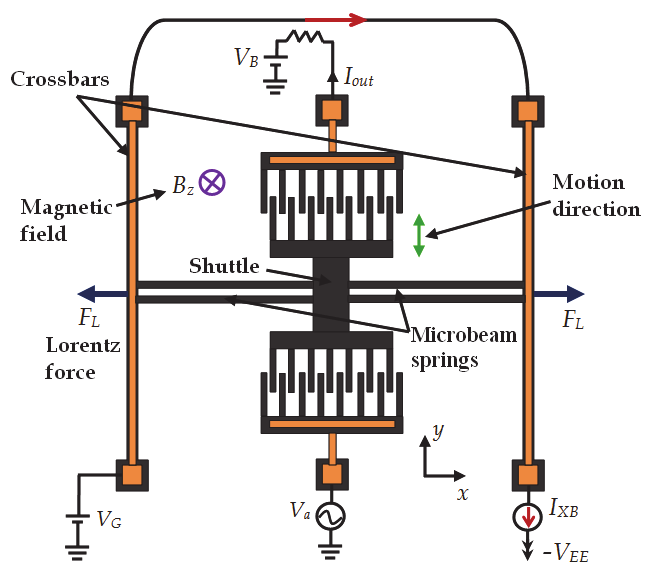 resonator is excited at its resonant frequency applying a dc voltage ( Vdc) to it and ac voltage ( Vac) to the half of the interdigitated combs. Its oscillating motion is monitoring using the other half of the interdigitated combs. A magnetic force acts on the resonator when an external