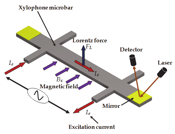 produces a Lorentz force that deflects the microbar. If the ac excitation current is supplied