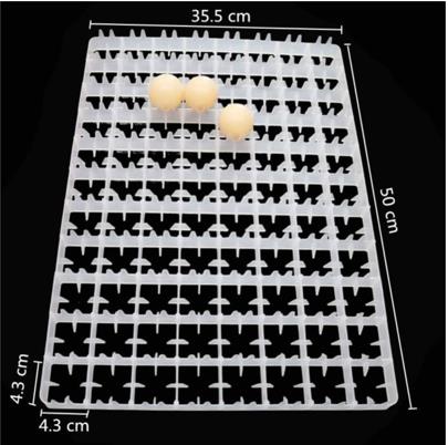 When candling hatching eggs on day 9 or 10, fil empty spaces on the setter tray by shifting remaining eggs backward to create complete rows, leaving the front rows empty.