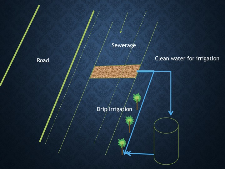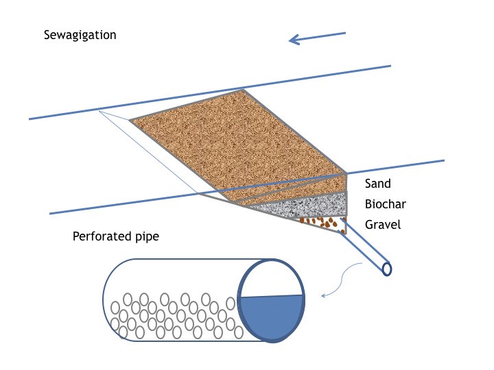 Through sewagiation, the irrigable water is harvested from the sewage through filtration using biochar, sand and gravel at the bottom of the sewerage system. The harvested water could also be used for recharging the groundwater in the peri-urban areas and diverted for irrigation. it is proposed to have annular / circular / segregated water harvesting structures in the peri-urban areas.