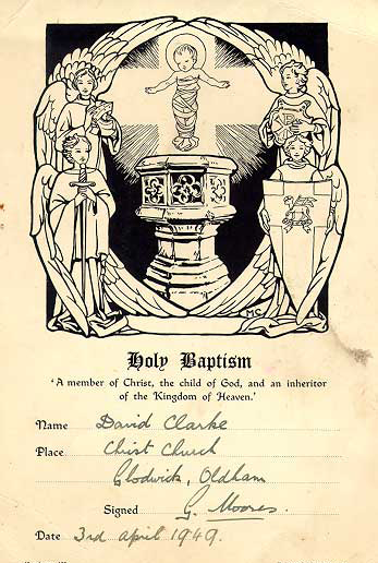 I was Christened at Christ’s Church, Glodwick and my Godfather David Maltby of 382 Barton Road, Stretford was a sideman at the Church on Barton Road, Stretford. He gave me at that time a bible with a text of scripture written on the inside cover. Prov. 3. 6 “In all thy ways acknowledge him and he shall direct thy paths “.