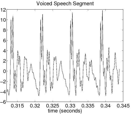 Voiced sounds, vowels for example, are produced by forcing air through the larynx, with the tension of the vocal cords adjusted so that they vibrate in a relaxed oscillation. This produces quasi-periodic pulses of air which are acoustically filtered as they propagate through the vocal tract, and possibly through the nasal cavity. The shape of the cavities that comprise the vocal tract, known as the area function, determines the natural frequencies, or formants, which are emphasized in the speech waveform. The period of the excitation, known as the pitch period, is generally small with respect to the rate at which the vocal tract changes shape. Therefore, a segment of voiced speech covering several pitch periods will appear somewhat periodic. Average values for the pitch period are around 8 ms for male speakers, and 4 ms for female speakers.