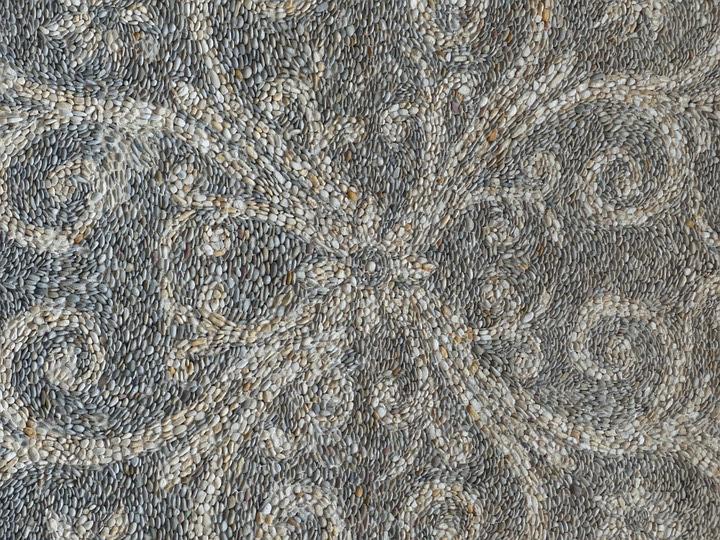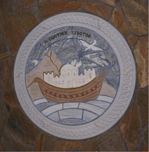 The rose bushes and decorative beds leave no doubt that the area is inhabited by women. The courtyard is laid out with stone slabs, partly decorated with terracotta elements. The path to the church is bordered by a meander, which is known as a braid or rope ornament. If you look closely, you will discover many artistic details. For example, Noah's ark with the inscription "Η ΣΩΣΤΙΚΗ ΚΙΒΩΤΟΣ" or the mosaic with two deer drinking from a stream.