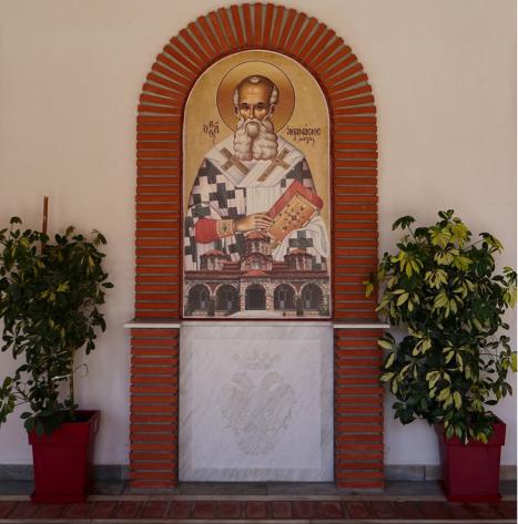 In front of the buildings, partly clad with natural stones, to the left and right of the path and in front of the church there are colonnades. Saint Athanasios is pictured next to a door. In the foreground you can see a faithful representation of the monastery church, which is protected by the saint.