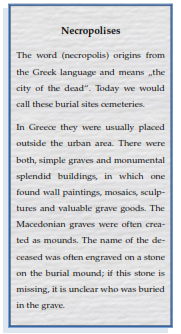 In the necropolises, the change of burying rites and the funeral customs over time can be observed. There were mostly earth burials, cremation of the deceased was rare. The dead were either burned directly in the grave or on wooden platforms. In some cases, the ashes were buried in copper kettles or clay pots. Toddlers were sometimes buried in common clay pots, which were broken for this purpose, and reassembled after embedding the body. In the 5th century BC, male corpses were buried with their head to the west, females with their head to the east. In the skulls of many of the deceased was the socalled Charon’s obol, which was put under the tongue of the dead, to pay the ferryman Charon for their transfer of the dead to Hades.