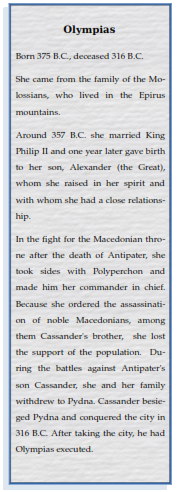 Pydna was first mentioned by the Greek historian Thucydides and gained importance during the Peloponnesian war. The Athenians besieged Pydna in 432 BC. King Archelaus I of Macedonia besieged the city around 410 BC from the land side, while the Athenian fleet took over the siege from the seaside. After Pydna was taken, Archelaus had moved the city 20 stadia (1 stadion = 600 feet (about 183 m)) further inland, in the area of today's Kitros. After Archelaus death, the inhabitants moved back to their previous location near the sea. 357 or 356 BC King Philip II, the father of Alexander the Great, conquered the city. 317 BC, Philips widow, Olympias, the mother of Alexander, was killed after the capture of Pydna by King Cassander.