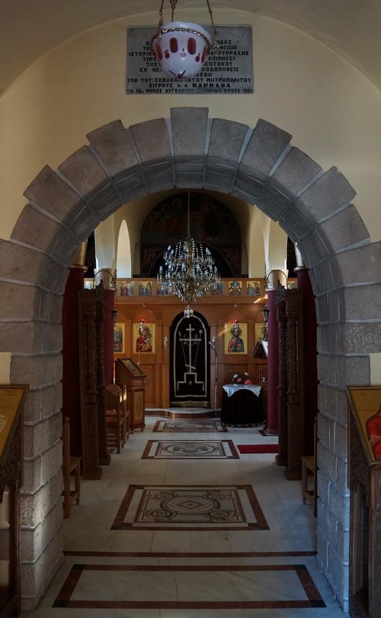 Inside, the church resembles that of Saint Dionysius in Litochoro in many details. One finds similar high desks with inlays, a huge chandelier decorated with images of saints and ostrich eggs, and bullet cases transformed into flower vases.