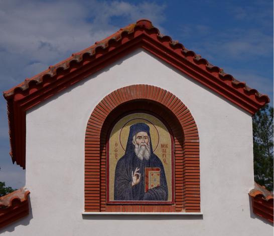 The visitor enters the complex through a gatehouse. Under the gable a picture of Saint Athanasios was painted. In the back of the house is a mosaic of the Saint Nectarios embedded in a niche. Notice how the artist depicts the vivid facial features and drapery of the robe.
