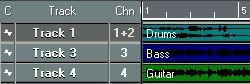 An Arrangement can contain a practically unlimited number of Tracks. Each Track has a Channel (Chn) setting that determines which audio channel the Track records and plays back on, just like you select MIDI Channel for a MIDI Track. The possibilities are: