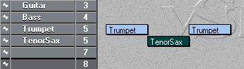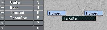 However, if there is any overlap between the two – if, for example, the saxophone starts playing in the middle of the trumpet, the two Tracks will compete for the single audio channel, and only one of them can use it at the same moment. In this case, the “latest” recording will always “steal” the audio channel, as described in the illustration below.