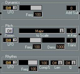 • These decisions are taken independently for each module. This means that you might e.g. get a note with the Pitch of the first note in the Phrase, the velocity of the seventeenth note in the same Phrase and a rhythmic distance from the preceding note that is 66% of the time between the fourth and fifth note in the Phrase.