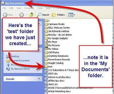 (Don’t forget – this test folder is now within your My Documents folder).If I now exit Kompozer and go to MY desktop and then access My Documents - this is what I will see.