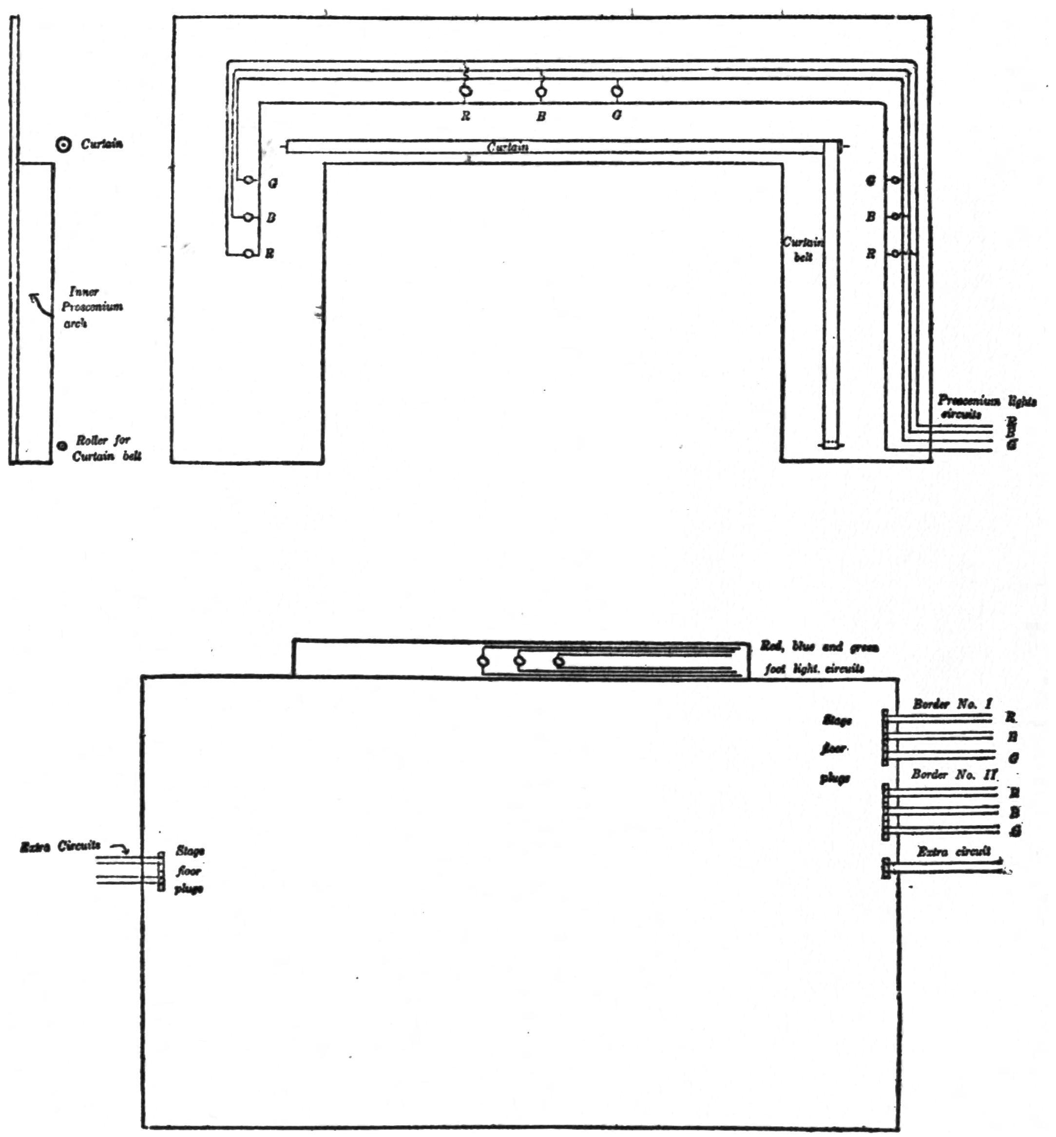 The proscenium arch should be built of ⅞″ stock, preferably of white wood, because of the fine surface which it presents, if it is to be decorated. The upright sections of the arch should be at least as wide as those shown in the diagram, because they must carry the three circuits for the proscenium lights, the belt that raises and lowers the curtain, and also special lamps and appliances that will be found necessary for various types of production. The diagram shows one green, one blue, and one red outlet on the two sections on the top section of the arch, but it will be found very convenient to have at least two outlets for each of these colors on each of the three sections of the arch.